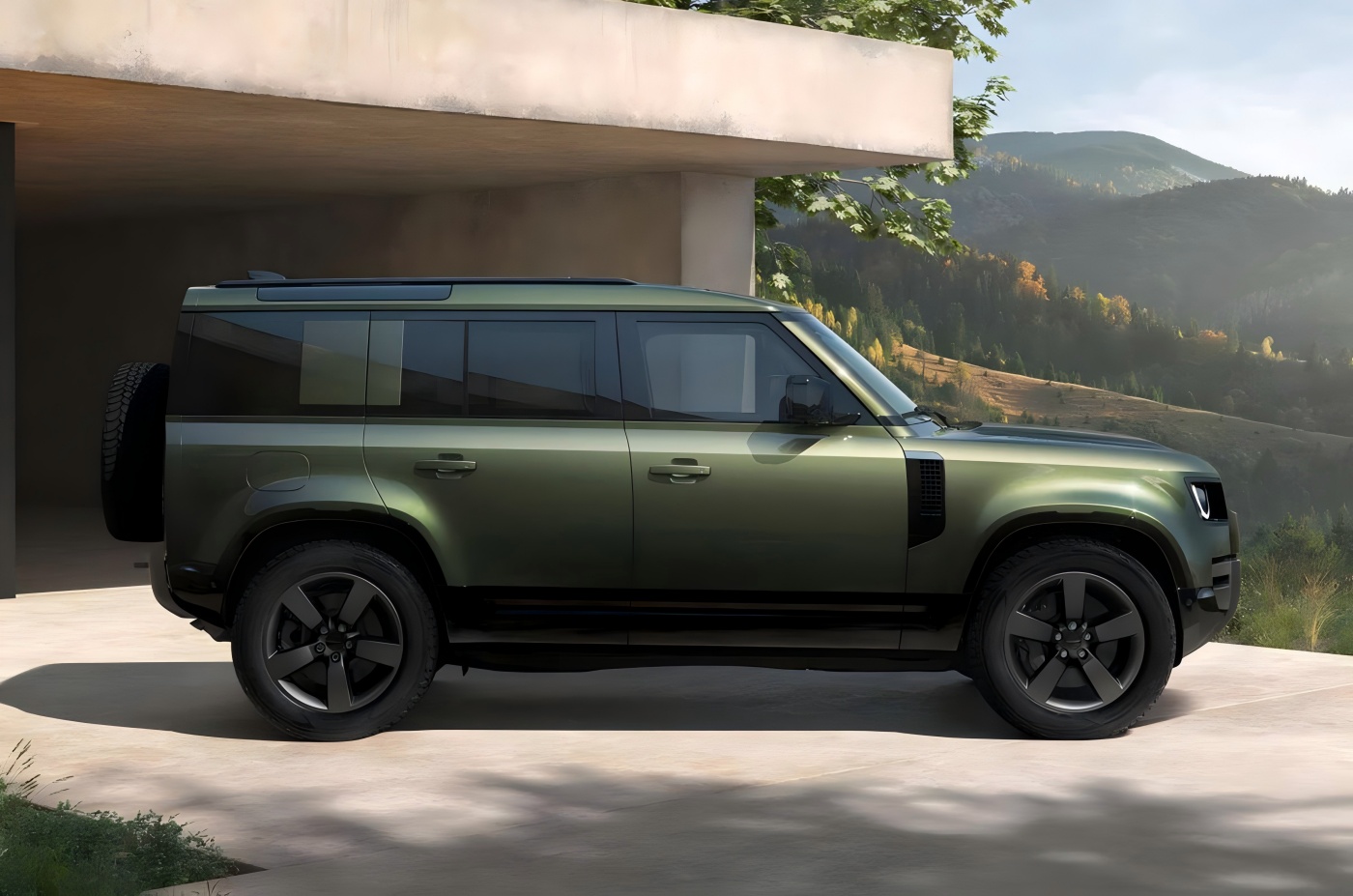 Πλευρά. Προβολή από την πλευρά, το νέο όχημα συνεχίζει το κλασικό στυλ του Land Rover Defender. Η έκδοση 110 υιοθετεί ένα σχεδιασμό τεσσάρων θυρών, με φαρδιά εμπρός και πίσω πλευρικά φτερά, μαζί με τροχούς πέντε ακτίνων και δαγκάνες φρένων πολλαπλών εμβέλειας. Οι διαστάσεις του σώματος παραμένουν αμετάβλητες, με μήκος, πλάτος και ύψος 5018/2105/1967 mm αντίστοιχα και με μεταξόνιο 3022 mm.